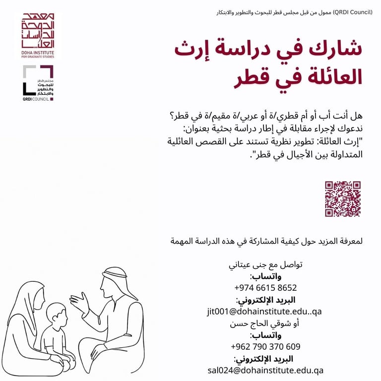 بحث "إرث العائلة" يسعى لاستكشاف وتوثيق التقليد الغني للقصص العائلية المتداولة بين الأجيال في قطر. نسعى لفهم كيفية تناقل القصص عبر الأجيال، والأغراض التي تخدمها، ومدى تأثيرها على الأسر والمجتمع.